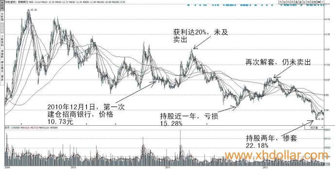 刚开始买入招商银行时,我信心满满地以为能复制巴菲特投资富国银行的成功,可招商银行却一路盘跌回我的成本区,把我套牢,好不容易熬到2011年4月份,股票反弹,大约获利达20%,就在我与兄弟们弹冠相庆时,招商银行却再度下滑,于2011年9月29日惨跌到9.09元(前复权),导致我深度套牢达15.28%。