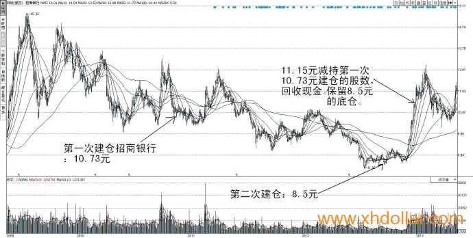 招行虽然表现很烂,但还是有一定涨幅的,在我第二次于2012年9月建仓之后,招行终于在2012年年末跟随银行股一起大涨,回到第一次建仓的成本区后,我保本回收了第一次建仓时资金,保留了第二次的底仓。