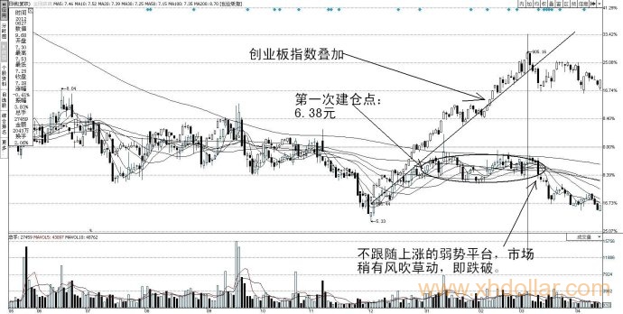 再来细看我所守的平台,如果用创业板指数叠加的话,用事后诸葛亮的视角来说:金刚玻璃的平台并非逆市场下跌的强势平台,而是在上涨市中资金不断流出的弱势平台,磨到后面根本不抗跌,最多搞搞假突破(最后的逃命良机,很多人却做发财梦),就要掉头向下了。