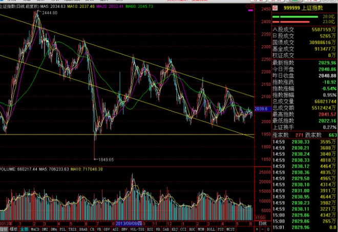 上证指数继续保持在下跌通道运行(图二),股指期货不给出方向,估计上证指数短期也不会走出什么行情,毕竟短线股指期货是老子,实行的是T+0,上证指数是儿子,只能T+1,老子不说话,儿子也不敢有什么表态。