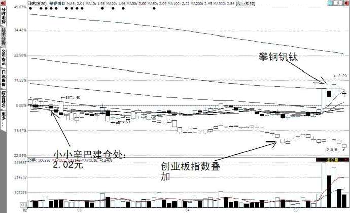 如果将创业板指数与攀钢钒钛的价格叠加,就会发现,自我于2014年2月21日以2.02元买入以来,至2014年5月16日收盘价为2.12元,只涨了一毛,好像涨得很少,连5%都不到。但是创业板指数却是从同日的1519点跌到了1226点,下跌19.3%,那些大家所钟爱的新经济股票大多创了年内新低。