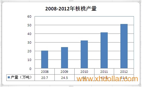 下图为2008-2012年全国核桃产量变化情况,又下图可见我国每年核桃的产量平均保持20%左右的增长率。产量的持续增加也反映出人们对核桃需求的增加。