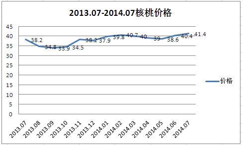 以上图表为核桃近一年来各大市场平均价格折线图,最低在2013年9月33.9,最高在2014年7月41.4,最高价和最低价之间相差7.5元/公斤,涨幅22%。核桃鲜果产新在9-10月份,图中所示当时价格到达相对低位,随后整体价格在小幅波动中总体趋涨。由此可以看出,核桃近一年来价格缓慢上升,行情相对稳定。