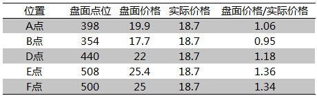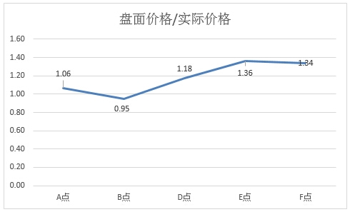 由以上数据可以看出,盘面价格与实际价格最接近的点是A点与B点,而D、E、F点的盘面价格均高于实际价格,此结论可以作为后期做空提供了参考依据之一。