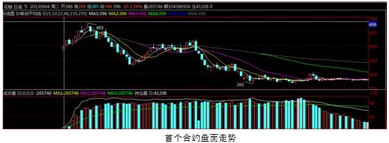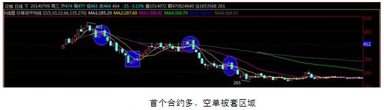 前两个合约走势属于完全相反的两个方向,第一个合约整体处于下滑态势,虽中途有所波动但波动幅度均有限。这可能是因为花椒合约才上交易盘,主力为了吸引跟多的参与者而故意做出的下滑趋势。第二个合约整体处于上涨态势,但较低一个合约盘面走势波动更为明显波动幅度也更大;随做参与者的不断增多,盘面走势的多样性也较之前有所增加。但整体的走势和实际市场花椒的行情变动差距做实是有点大,这种高溢价的波动,也使得盘面损失了一部分参与者。