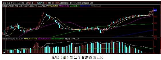 北川维斯特花椒(HJ)第二个合约是2013年12月23日开市的,开市点位408,盘面整体处于溢价发行状态。盘面开始走势和首个合约走势基本雷同,都是小幅上扬,吸筹活盘走势。但盘面的下滑调整并没有首个合约那么明显,反而是呈现持续上扬之势。虽后来出现了一个较大幅度的下滑,但其最低点位和花椒的实际价格相差甚远。盘面整体走势都是处于高溢价的上扬走势。由于有首个合约的所攒积下来的参与者,盘面的整体较首个合约有明细增长。