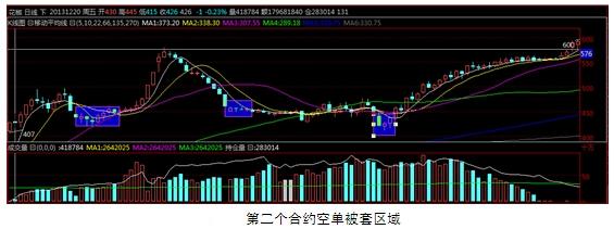 盘面不存在真正意义上的多单被套情况,因为其走势整体是向上行的,如果非要说多单被套那也只有第一次空单被套后盘面上行到最高点处有部分多单被套,但当时交易量偏少,所以笔者认为盘面实际上不存在多单被套的情况。