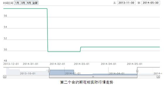 图7所示的是,在北川维斯特花椒(HJ)第二个合约期间实际市场花椒的总体行情走势情况,我们可以很明显的看出,花椒的行情是处于稳步下行的态势,虽中后期出现小幅回升,但其回升幅度有限。我们结合花椒第二个合约的盘面情况来看,整体走势虽存在一定的相似性,其溢价的程度过高。