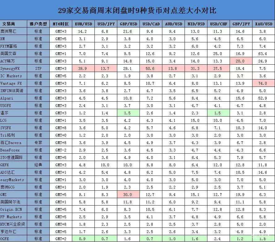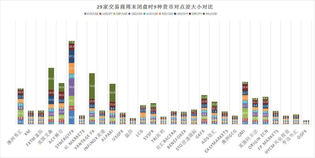 为了更直观地了解各平台商,周末闭盘时收集29家平台商的9种主要货币对点差数据,同时汇总整理各平台商MT4所在时区,以表格和图表形式加以整理分析,以方便广大汇友进行对比。