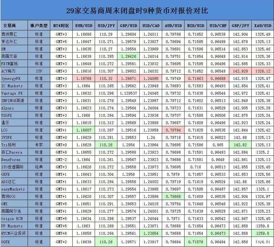 周末闭盘是很多投资者观测平台的一个因素,也是了解平台流动性的一个比较好的方面。为了比较各大平台周末闭盘报价情况,我们特意收集了29家平台的9种主要货币对闭盘前最后一个报价数据,并做成表格以供大家对比分析。