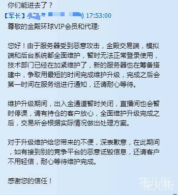而平台方的解释是,由于服务器受到恶意攻击,平台交易客户端、模拟端和后台系统都全面维护,新的服务器也在筹备搭建中,请耐心等待。维护期间,出入金通道暂关闭,直播间也会暂时停课,请持仓客户放心,系统维护升级完成后,交易所会根据实际情况做出处理方案。