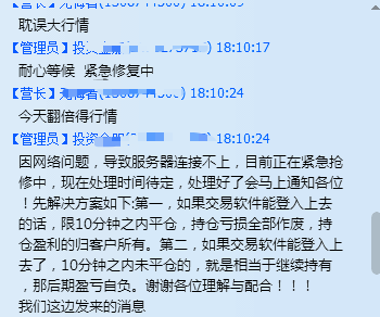 该群管理员也回应称,因网络问题,导致服务器连接不上,目前正在紧急抢修中,现在处理时间待定,处理好了会马上通知各位!先解决方案如下:第一,如果交易软件等登录上去的话,限10分钟之内平仓,持仓亏损全部作废,持仓盈利的归客户所有。第二,如果交易软件等登上去了,10分钟之内未平仓的,就相当于继续持有,那后期盈亏自负。以下为QQ群截图: