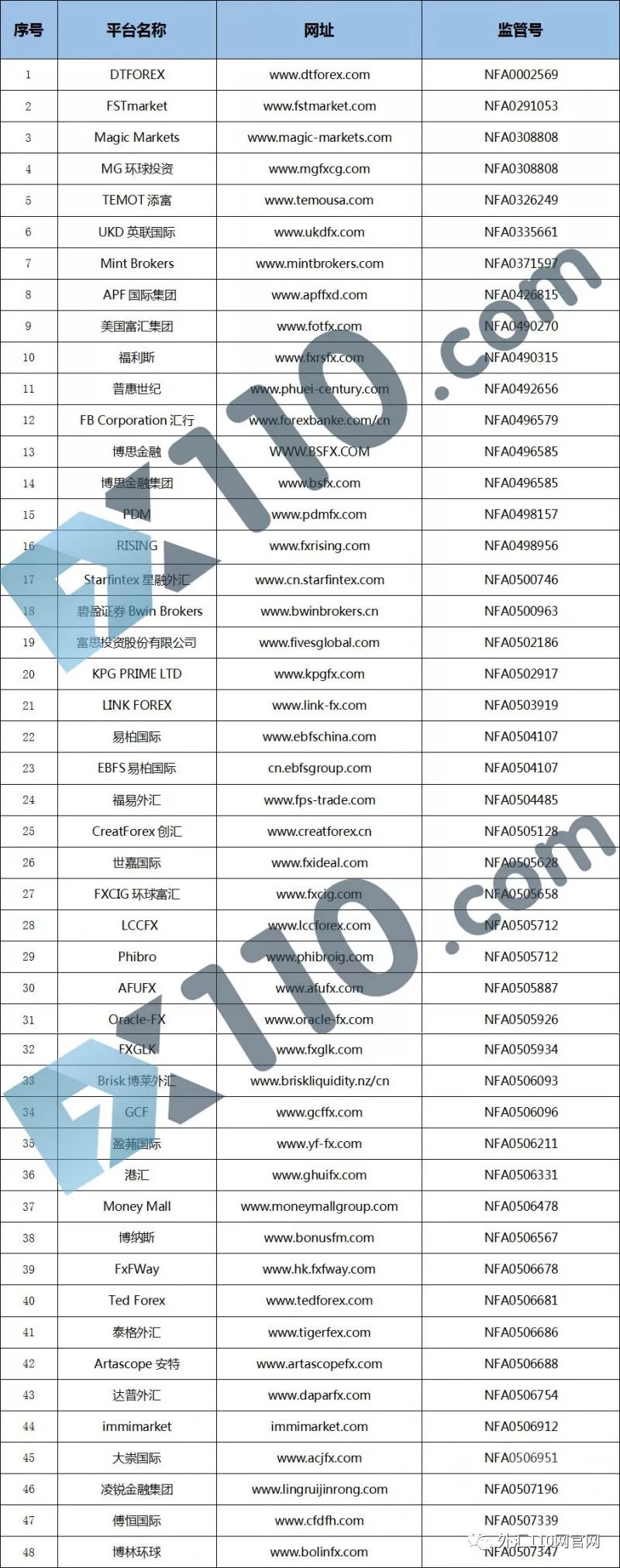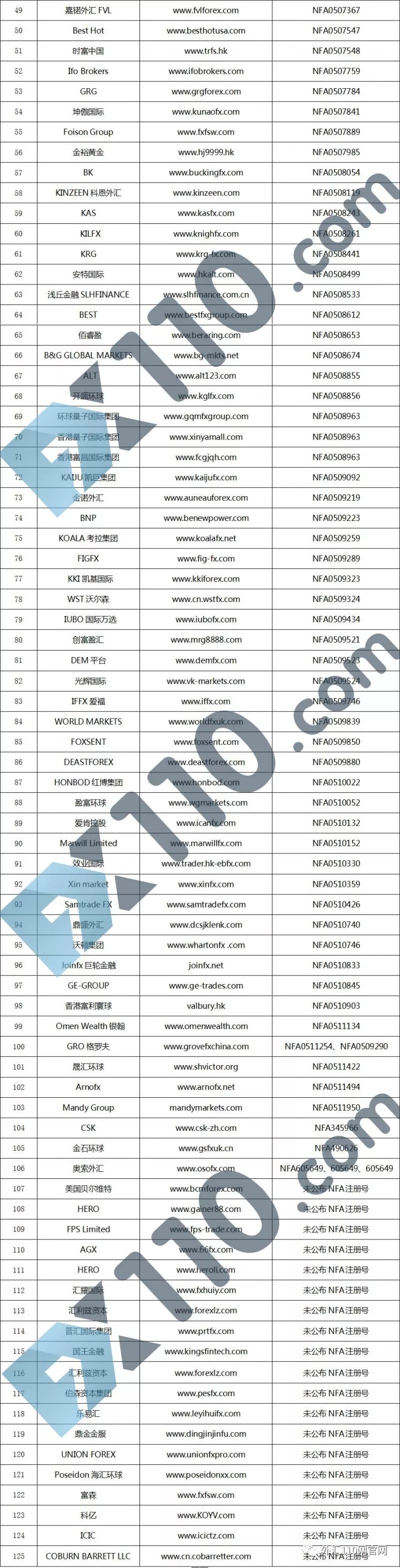先公布一张虚假宣传NFA监管的外汇交易商黑名单,看看有没有你熟悉的平台(点击图片查看高清大图)。