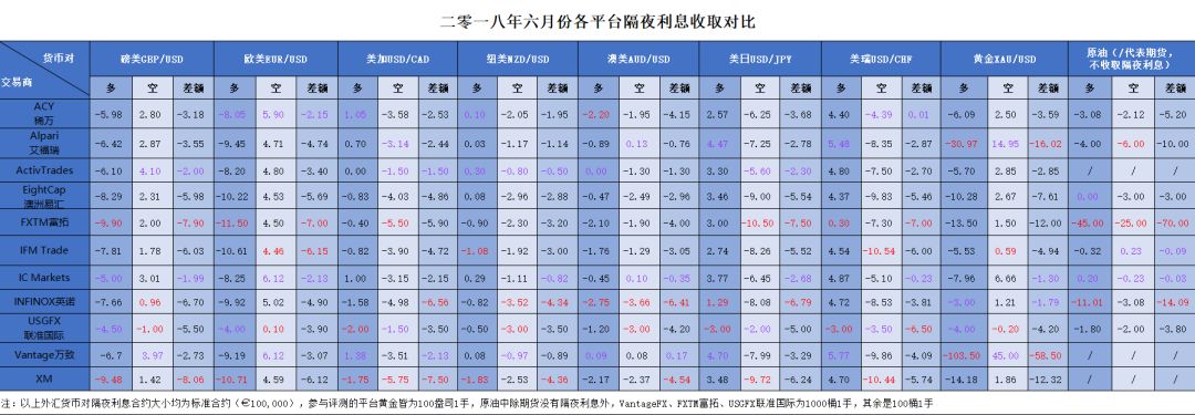2018年6月份11家交易商隔夜利息收取费率对比(点击查看大图)