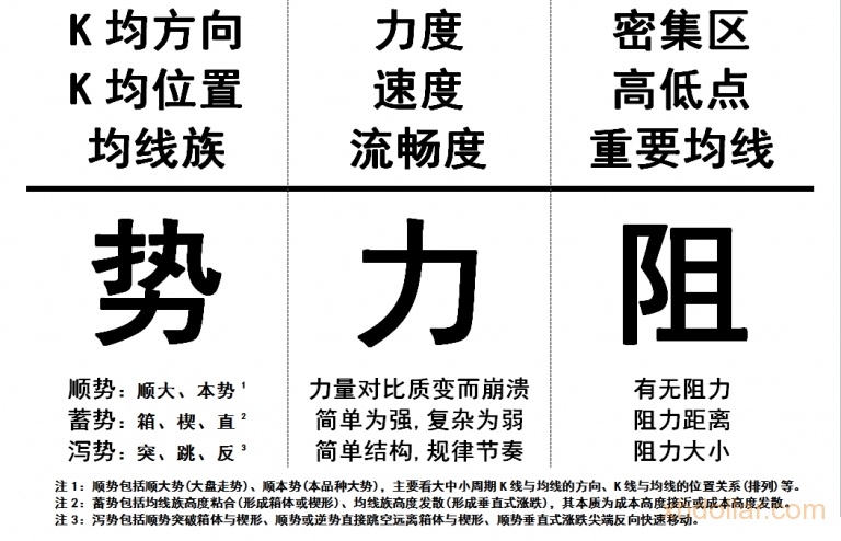K线方向、K线位置、K线族决定行情趋势;价格走势力度、速度、流畅度体现行情上涨(下跌)力度;成交密集区、最高(最低)价位、重要均线形成阻力。