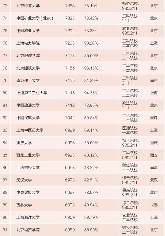 百强中,有11所财经院校、7所语言院校、5所艺术院校,这些专业性传统强校中绝大部分并非985或211大学,但都属于这个学科中的佼佼者,也很受用人单位的欢迎,也是非常容易拿高薪。