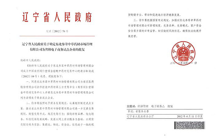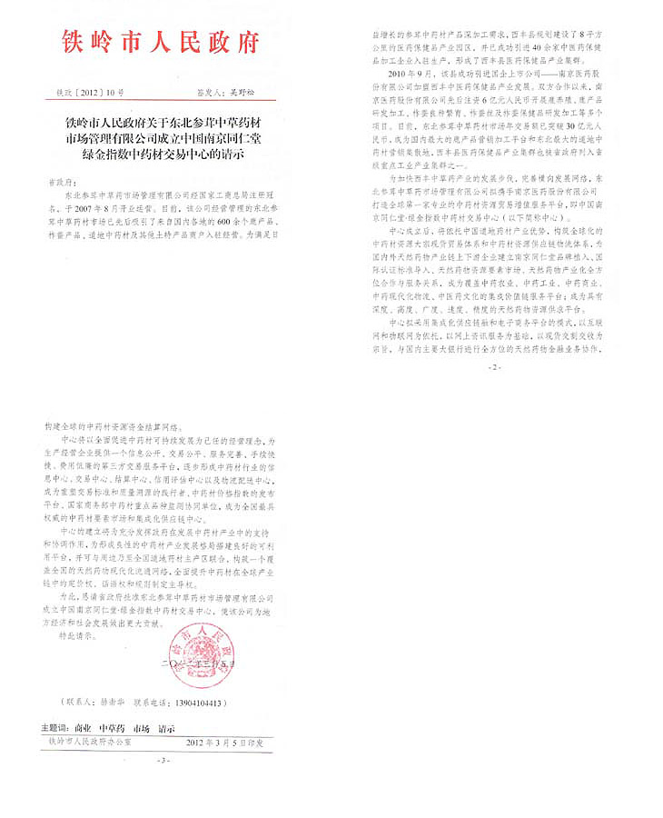 1、2012年4月16日,辽宁省人民政府对铁岭市及同仁堂绿金中药材交易中心的批复