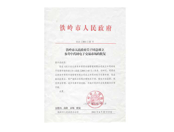 3、2011年6月22日,铁岭市人民政府批准西丰县以及东北参茸中草药材市场管理有限公司成立中药材电子交易中心