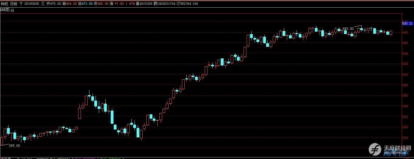 我就拿最近吵的纷纷扬扬的枸杞合约来说吧,枸杞本是8月,9月份产新的品种,合约交割月为11月份中旬。从合约5月份开启,经过了前期小幅度的诱空,行情就开始疯狂的往上来从低点280点一直拉到高点500点。