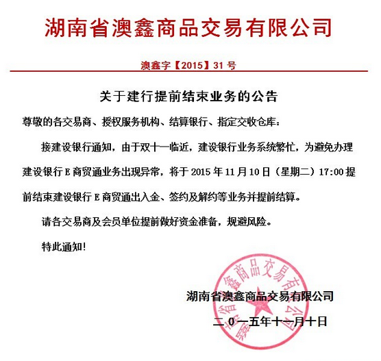 11月10日,湖南澳鑫商品交易市场发布关于建行提前结束业务的公告称,将于2015年11月10日(星期二)17:00提前结束建设银行E商贸通出入金、签约及解约等业务并提前结算。公告原文如下: