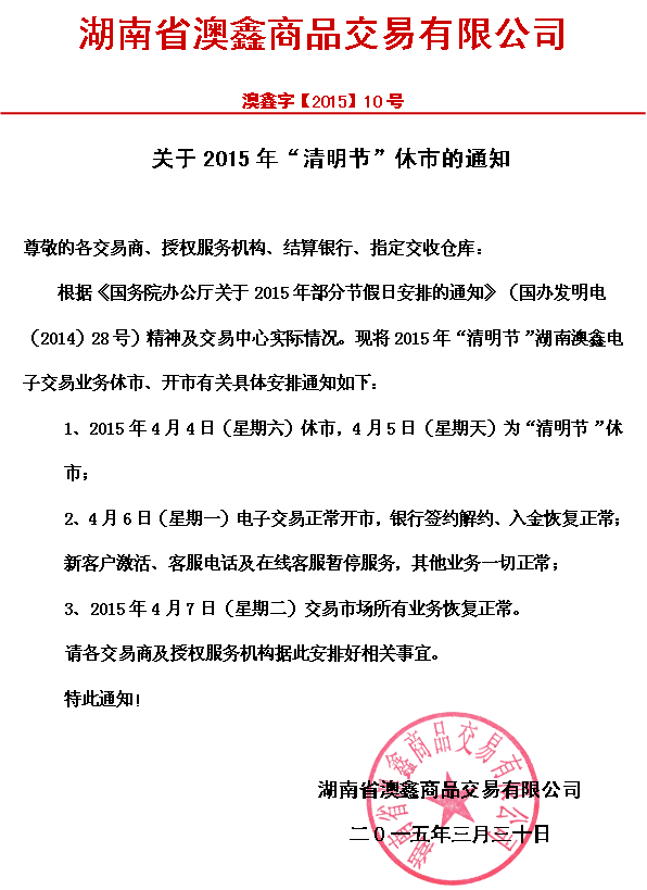 湖南澳鑫商品2015清明节休市放假安排 2015-03-10 12:13 • 资讯 • 阅读 3390 3月10日,湖南澳鑫商品交易市场发布关于2015清明节休市的公告,具体安排如下。 3月10日,湖南澳鑫商品交易市场发布关于2015清明节休市的公告,具体安排如下: 湖南澳鑫2015清明节休市的公告 文章内容仅供参考,不构成投资建议,投资者据此操作风险自负。转载请注明出处:天府财经网 湖南澳鑫 赞 (0) 0 生成海报 [南方大宗] 茯砖茶、百两茶3月10日行情分析 上一篇 2015-03-10 09:00 江苏省金融办正式批复中苏商品交易中心 下一篇 2015-03-10 21:48 相关推荐 湖南省整改通知曝光 限期4月底前对19家商品现货交易场所彻底整改(名单) 2月20日,湖南省商品清理整顿小组办公室(湖南省商务厅)发布关于做好商品现货交易场所规范整改工作的通知。通知显示,湖南省商品现货交易场所整改期限为2017年4月30日。 湖南省商品现货交易场所8个方面进行彻底整改: 1、停止新上发售、微盘交易等违法违规保证金比例,并预留足够资金应对有关风险处置。 3、清理撤销各种虚假不实的宣传广告,包括会员、代理、居间商均不得以获得各级政府或相关职能部门批准备案和通过银行第三方资金存管等不实之词进行对外宣传。 4、清退参与交易的自然人客户。 5、清理整顿或清退不合规的运营中心)、代理商、居间商。 6、全利做好客户举报投诉处置工作。所有涉企举报投诉事件,实行“谁家孩子谁来抱”,由涉诉企业兜底负责、包干处理。 7、切实建立健全内部管理制度。包括投资人适当性审查制度、会员单位管控制度、风险防控制度、重大事项报告制度等,制定风险警示和突发事件应急处置预案。 8、根据《商品湖南久丰国际商品现货交易场所 2、湖南交易中心 3、湖南省大宗商品现货交易中心 5、湖南华夏商品交易有限公司 6、湖南银楼现货商品华夏银都大宗商品现货交易中心 8、湖南润达大宗商品电子商务有限公司 9、湖南中南大宗商品电子商务有限公司 10、大宗商品交易有限公司 12、湖南农产品现货电子市场 17、长沙南方大宗贵金属外汇行业却是政策暖风频吹。近日,国家外汇局副局长方上浦在《中国外汇》刊文,表示将逐步取消微观领域汇兑限制。业内预期,这将进一步加剧国内资产配置的趋势,为韦德金融集团驻青岛办事处诚招外汇经纪代理机构(代理无需成本支出,平台优势、客户盈利模式等详见https://www.tianfufin.com/touzi/132052.html)。咨询电话/ 2017-03-12 • 资讯 4.4K1 资讯 清理整顿“回头看”波及的交易场所名单(交易品种退市、停止新开业务) 清理整顿各类交易场所部际联席会议第三次会议部署清理整顿“回头看”工作之后,各类交易场所开始等待监管“皮鞭”的挥出。春节假期后,部分地方政府的“回头看”工作实施方案及相关通知开始陆续传出,各类贵金属贵金属交易中心这类以贵金属交易为主的平台外,也有诸如河北滨海交易市场这类近几年才出现的以暂停交易开始休整。 值得注意的是,面对清理整顿的政策高压,除了像交易商和交易保证金比例、逐步下线保证金比例、下线交易品种、停止新开业务往往就是停盘的前兆。为此,现货岛整理了2017年以来受清理整顿波及调整相关业务的交易场所名单,以供大家参考,做好风险控制。 2017年2月 交易品种下线 2月21日,大连贵金属交易中心发布通知,自2月22日(星期三)起,白银、石化一号、现货铂金等商品停止建立新仓;3月10日(星期五)上述商品休市前仍有上述商品持仓的横琴稀贵商品交易中心:调整报价挂牌产品履约保证金比例 2月17日,大宗商品交易市场:停业自查整顿 2月11日,河北滨海大宗商品交易市场官网发布通知,根据1月9日清理整顿各类交易场所部际联席会议第三次会议的相关指示精神,经公司研究决定,于1月20日起,停业自查整顿。自查整顿期间,公司会员可随时通过登录交易客户端查询所属交易账户内的资金、持仓情况及资金所在银行等相关信息;所有会员交易账户内的资金、货权全部安全。 辽宁利安达贵金属交易中心:所有交易品种下线 2月10日,辽宁利安达贵金属交易中心发布交易品种下线通知,2月13日开市起,停止新客户开户,停止所有交易品种新开仓,停止客户入金;2月17日将线上所有交易品种下线。2月17日17:00前交易账号完成出金,关闭出金端口。 宁夏西邮文化艺术品交易中心:停止客户开户业务 2月10日,宁夏西邮文化艺术品交易中心发布通知,根据市场战略发展需要,2月13日(星期一)起停止客户开户业务。 无锡市乾圆大通商品合约交易中心:… 2017-02-23 7.6K1 资讯 商务部公示不具备原油经营相关资质交易平台/会员单位名单(137家) 商务部公示了“不具有原油、成品油仓储、批发、销售经营资质”的137家企业名单,包括交易所和会员单位/经纪公司,现货岛将名单整理如下,供投资者选择交易平台、会员单位(经纪公司)时参考。 2016-10-19 34.8K2 资讯 湖南澳鑫:交易系统全面更换 创硕系统26日收市后停止使用 【澳鑫商品湖南澳鑫2.0系统上线的通知》。 湖南省澳鑫商品交易市场对交易商可向所属的 2016-01-27 2.7K0 资讯 湖南澳鑫举办12月份工作总结暨表彰大会 1月8日下午,湖南澳鑫12月份工作总结暨表彰大会在总部隆重举行。董事会及全体员工参加,会上总结工作,表彰先进,展望未来。 2016-01-08 2.2K0 发表回复 您的邮箱地址不会被公开。 必填项已用