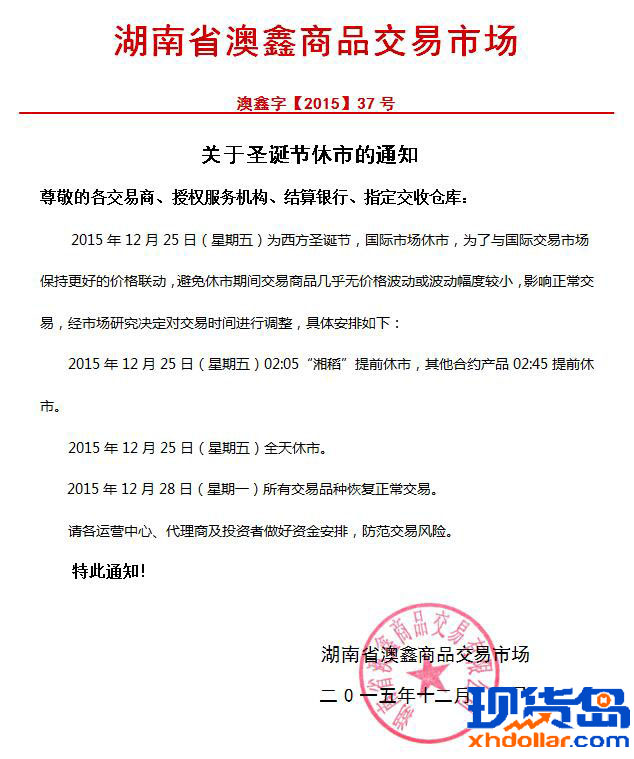 【现货岛12月18日讯】今日,湖南省澳鑫商品交易市场发布了《关于圣诞节休市的通知》,根据市场安排,12月25日(星期五)为西方圣诞节,国际市场休市,为了与国际交易市场保持更好的价格联动,避免休市期间交易商品几乎无价格波动或波动幅度较小,影响正常交易,澳鑫商品决定,12月25日(星期五)02:05“湘稻”提前休市,其他合约产品02:45提前休市;12月25日(星期五)白天全天休市;12月28日(星期一)所有交易品种恢复正常交易。