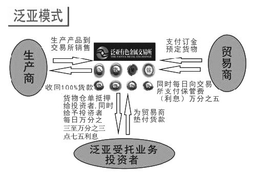 对于投资商,泛亚推出每日收益率为万分之二点八五至万分之三点五六(年化收益为13.5%的资金受托业务),以此来吸引投资者。对于交货商,泛亚号称大量的民间资本通过参与供应链金融,为产业支持提供大量的资本。