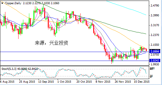 受圣诞节假期影响,上周铜市主要以了结头寸为主,铜走势也较为震荡,但仍守住2.10关口。今年迄今为止,铜价已经累计下跌了四分之一,为2008年金融危机以来最大年度跌幅,但由于预期明年美联储将继续加息,以及中国经济持续面临下行压力,秘鲁2016年铜产量或跳升,市场依旧不看好明年铜价。日内关注美国12月达拉斯联储制造业活动指数。