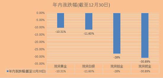 其他贵金属方面,现货白银全年料下跌约11%。现货铂金料跌28%,创2008年以来最差年度表现。现货钯金料全年跌31%,为表现最差的贵金属。