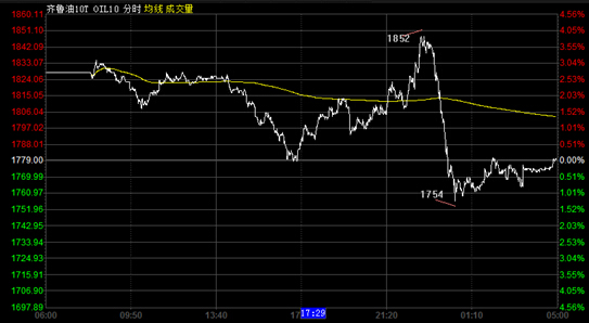 齐鲁油(重油)跳空高开在1824,亚盘时段震荡回落,美盘时段在摸顶1852后下探日内低点1754,尾盘收在1781,日内波动98个点,微涨0.11%。美原油、布伦特原油价格齐平,由高位回落,分别跌0.33%、0.58%。
