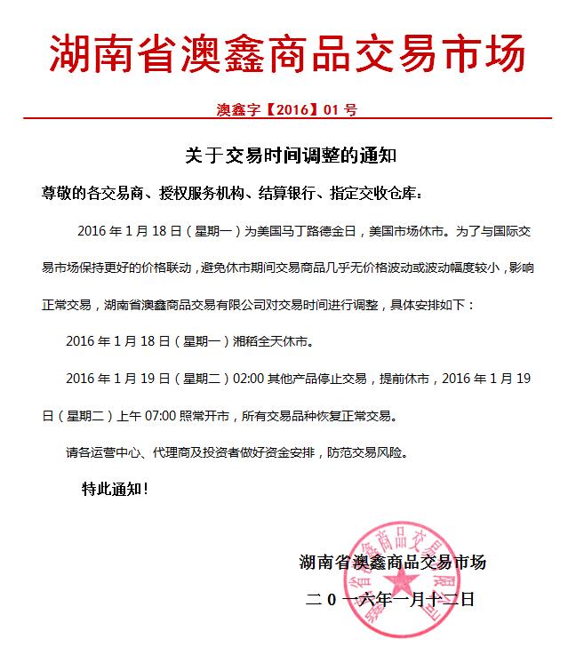 【现货岛1月13日讯】12日,湖南省澳鑫商品交易市场发布《关于交易时间调整的通知》。