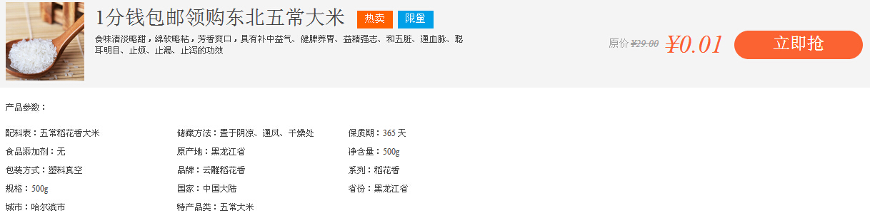 指南针地标商城第一届年货节开集啦,为回馈广大新老顾客,商城推出“1分钱包邮领五常大米”活动。