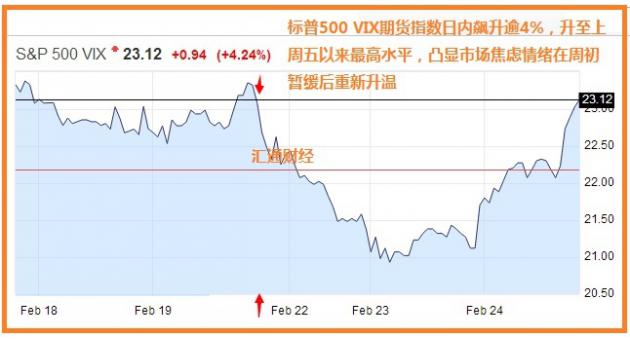 下图所示,标普500 VIX期货指数近日持续飙升,日内目前已涨至上周五(2月19日)美股盘初以来的高位,表明周初急剧降温的市场焦虑情绪目前重新回归。
