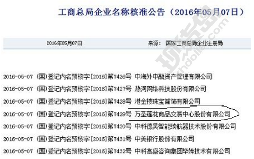 无独有偶,5月7日,又有一家交易场所注册名称叫“万圣莲花商品交易中心”。