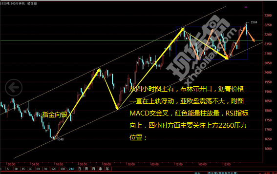沥青原油从四小时图上看,布林带开口,价格一直在上轨浮动,白盘震荡不大,附图MACD交金叉,红色能量柱放量,RSI指标向上,四小时方面主要关注上方2260压力位。