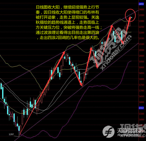 但是这种上涨形态一旦终结,回调力度也是相对较大的。回调需要关注短期均线支撑。结合周线来看,在吞没组合看涨信号出现后,走势上并未出现回调而是直接上行,周线布林带走平有拉开迹象。油价走势上需要关注2400压制。