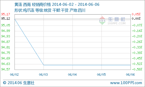 市场行情分析:本周黄连价格小幅下滑,疲软运行。周初,由于端午节刚过,黄连行情低迷,市场货源减少,无外地药商购货,本地经销商关注较少,货源走动缓慢,黄连价格小幅下滑;周末,虽然黄连行情不好,但市场实际需求量还是有的,货源零星走动,行情稳定运行。因此从整个行情看,本周黄连价格疲软运行。