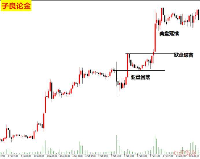 注解:早盘下跌或者慢跌之后,形成一次向上的反弹测试亚盘的高点位置,二次回落不破早上下跌低点的位置,而之后延续二次拉升上涨,突破了早盘高点或早间下探反弹后的高点位置,美盘很少会再延续下跌,而是延续欧盘的上涨行情继续上涨,刷新高点位置,美盘的操作思路将以前低点的位置继续顺势做多,而并非不断找高点去布局空单。美盘多数情况下会震荡或者延续欧盘的上涨。