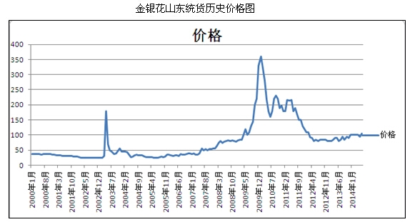 2005年药典将山银花和金银花区别开来,金银花价格持续上涨。在04年—09年之间,金银花处于一种稳中有升的状态。