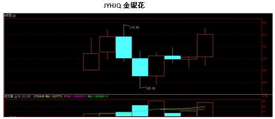 以上是JYHJQ的盘面图,该合约与2014年6月17日开盘,至今2014年6月26日已有8个交易日,盘面开盘不久尚处于大涨大降的走动情况,具体走向尚未成形。其中第三个交易日和第四个交易日分别出现最高点115.6和最低点105,两点之间的下降幅度在9%左右,该合约1批为1公斤,所以105-115的价格与现市是相符的。截至文章书写之日盘面出现大幅上涨,量比也高达381.64%。说明该盘面参与者增加,后市的走向也将随着参与的越高而清晰起来。