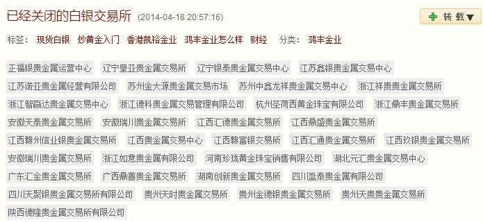 最新被整顿的现货和白银市场名单(图) 2014-07-01 01:32 • 资讯 • 阅读 6359 天津元创商品、东方鼎盛、山西大宗,以及34家已经被关闭的现货白银交易所。 2 / 212 文章内容仅供参考,不构成投资建议,投资者据此操作风险自负。转载请注明出处:天府财经网 赞 (0) 0 生成海报 2014年即将整顿的现货市场名单 上一篇 2014-07-01 01:21 证监会联合多部委打击贵金属违规平台 下一篇 2014-07-01 01:48 相关推荐 资讯 嘉里建设的"豪宅悖论":卖爆了,却赚少了 346.84亿港元,同比增长175%——这是嘉里建设近年来最强劲的销售增速。 2026-03-23 190 资讯 ESR的滑铁卢:从“亚洲版黑石”到退市卖资产 高杠杆扩张埋下致命隐患,2024年净亏损7.26亿美元,市值从千亿港元缩水至不足200亿,2025年被迫私有化退市——ESR的滑铁卢,既是资本败局,也标志亚洲物流地产粗放扩张时代的终结。 2026-03-23 250 千载诗人地 今朝再出发——“爱中华 爱家乡”2026中国农民诗会从这里出发暨第十一届杏花村文化旅游节正式启幕 三月的池州,杏花如雪,春水如蓝。 3月21日上午,2026中国农民诗会从这里出发暨第十一届杏花村文化旅游节在杏花村文化旅游区拉开帷幕。这是中国农民诗会连续第三年落户“千载诗人地”池州。今年的诗会以“爱中华 爱家乡”为主题,在行进式沉浸观演中,让诗歌从纸上走向田野,从舞台扎根乡土。 一堂课,唤醒千年文脉 “当陵阳之焉至兮,淼南渡之焉如;路漫漫其修远兮,吾将上下而求索……”,诗会在情景表演《学堂第一课》中开启。池州市贵池区人民路小学的孩子们,在“先生”陈敬东的带领下,齐声诵读与池州渊源深厚的千古名篇——屈原在青阳陵阳酝酿《离骚》,李白五游秋浦留下47首诗篇,岳飞登临翠微亭写下“好水好山看不足”。童声清脆,如春雨润物,千年前的诗句在这一刻重新苏醒。远处傩舞鼓点响起,古老非遗与现代童声交汇,诉说着“千载诗人地”的生生不息。 情景表演 一片田,守望粮安天下 稻田表演区,歌手袁忠山与池州民歌手胡俭玉联袂献上《山歌对唱》,用最质朴的嗓音唱出土地的温度。“二十二连丰传捷报嘞,全省增幅第一名哎”——歌声里,是池州粮食生产的骄人成绩。种粮大户王高林和农技专家陈敏走上舞台,分享新农人扎根田野,科技赋能粮食增产的故事。来自安徽的诗人宇轩分享他的作品《田野考察》:“我发现窗外云雀也会恪守时间,早晨六点,他们像是约好了一样,在悬铃木上吟唱赞美诗”。来自江苏徐州的农民诗人姚刚用《我是一粒谷米》礼赞丰收:“一粒谷米,一颗定心丸,种在百姓心坎,托举家国安康。”粮安天下,国泰民安——这是土地的回答,也是农民的誓言。 稻田表演区 移步特产展示区,九华黄精、石台富硒茶、池州鳜鱼、竹制品依次排开。歌手“大衣哥”朱之文、主持人冯云飞、王峰以“说唱诗”形式推介池州特产,让观众在欢笑中记住了池州好物。美食品鉴区里游客爆满,农民歌手“大船哥”刘广局一曲《弹起我心爱的土琵琶》,引来全场轻唱。 特产展示区表演 一民宿,遇见诗意… 2026-03-23 • 资讯 1.3K0 资讯 2026铅锌产业博览会即将开幕!3.25-27四川成都相聚! 由上海有色网(SMM)主办、盛屯矿业集团股份有限公司独家冠名的2026 SMM(第二十一届)铅锌大会暨产业博览会,将于2026年3月25-27日,在四川·成都雅居乐豪生大酒店举办。 大会采用“展+会”双驱并行的模式,人数规模3000+,现场有80+展台,期间设置主论坛、全球铅锌金属与矿业投资贸易联动论坛、电池应用市场论坛、铅锌市场高质量发展论坛、铅锌绿色智能发展前沿论坛、冶炼技术与综合资源利用论坛这六大论坛,还将设置专场对接会、名企参观考察等活动。 目前观众免费注册通道已开启,扫码注册观众,现场带名片签到即可获得观众证,畅逛展区!(签到方式除了用名片之外,还包括:会前发送报名确认短信,凭短信签到;在现场再次注册也可签到~) 免费注册观众 已确认参与本届铅锌大会的企业包括盛屯矿业、江铜铅锌、中金岭南、驰宏锌锗、金利金铅、巴紫、新紫、万洋锌业、西能锌业、奥龙锌业、托克、三水实业、中远海运、湖南白银、超威、风帆、巨江、京九、杰斯特、丰越、华信、高能环境、云南锡业、云南振兴、九华新材、昊龙实业等超千家铅锌企业。 【观众权益】 ……更多权益,等您签到后进入展区探索! 【大会三天日程】 2026-03-22 390 资讯 豫能控股11亿'跨界'数据中心:一场豪赌还是战略转型? 在火电盈利修复、AI算力需求爆发的双重背景下,豫能控抛出上市以来最大一笔跨界资本运作,正式切入超大规模数据中心(IDC)赛道。 2026-03-22 730 发表回复 您的邮箱地址不会被公开。 必填项已用 * 标注昵称: 邮箱: 网址: 记住昵称、邮箱和网址,下次评论免输入 填入阿拉伯数字完成算式 + 87 = eighty eight Powered by MathCaptcha 提交